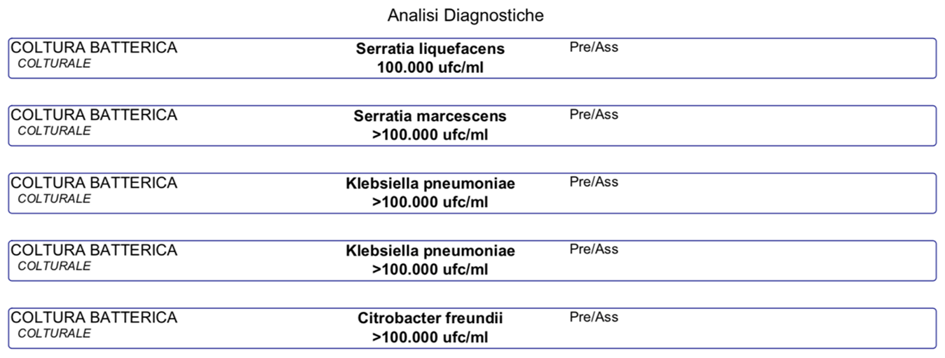 I risultati delle analisi microbiologiche, invece, non hanno evidenziato la presenza dei batteri ricercati anche se va sottolineato che le tecniche di analisi colturale presentano dei limiti. Tali metodi richiedono un grande impegno di tipo umano e la corretta esecuzione di tutte le fasi del processo come, ad esempio, la modalità di prelievo, trasporto e trattamento del campione, la scelta dei terreni di primo isolamento, l’incubazione delle colture e l’identificazione delle specie batteriche. Per ridurre al minimo l’errore umano e riuscire a individuare anche l’eventuale ridotta presenza di questi microrganismi, sarebbe meglio ricorrere alle nuove tecniche molecolari, quali la Next Generation Sequencing (NGS) e Whole Genome Sequencing, (WGS), che consentono l’amplificazione di frammenti batterici di piccole dimensioni. È interessante rimarcare, però, la presenza di Klebsiella pneumoniae che è oggi riconosciuta come una minaccia urgente per la salute umana a causa dell'emergere di ceppi multiresistenti associati a epidemie ospedaliere e ceppi ipervirulenti legati a gravi infezioni acquisite in comunità.