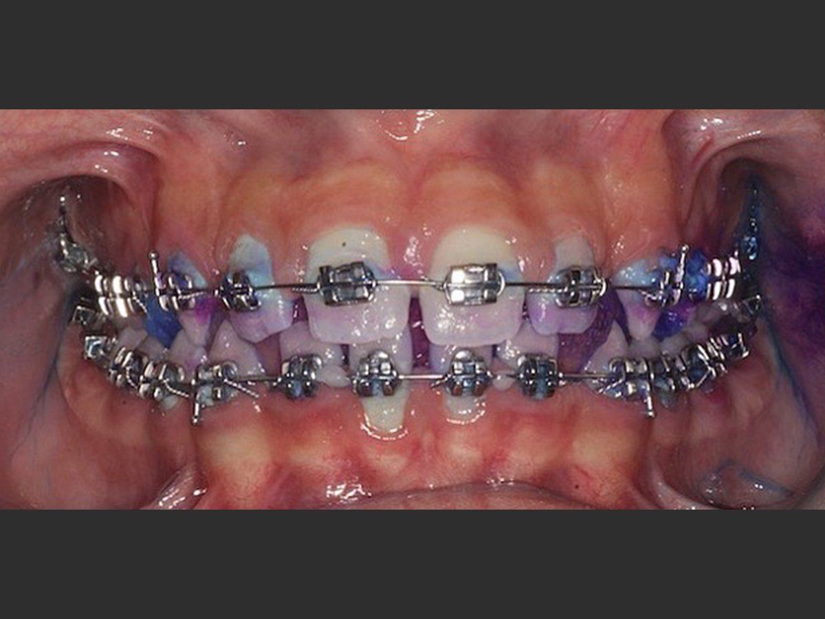 Fig. 1 - Case report di ortodonzia tradizionale. Fotografia frontale a t0 con rilevatore di placca.