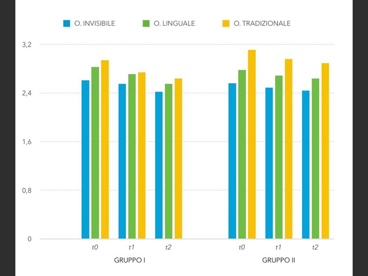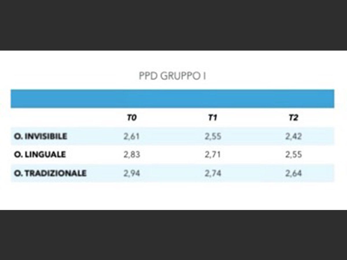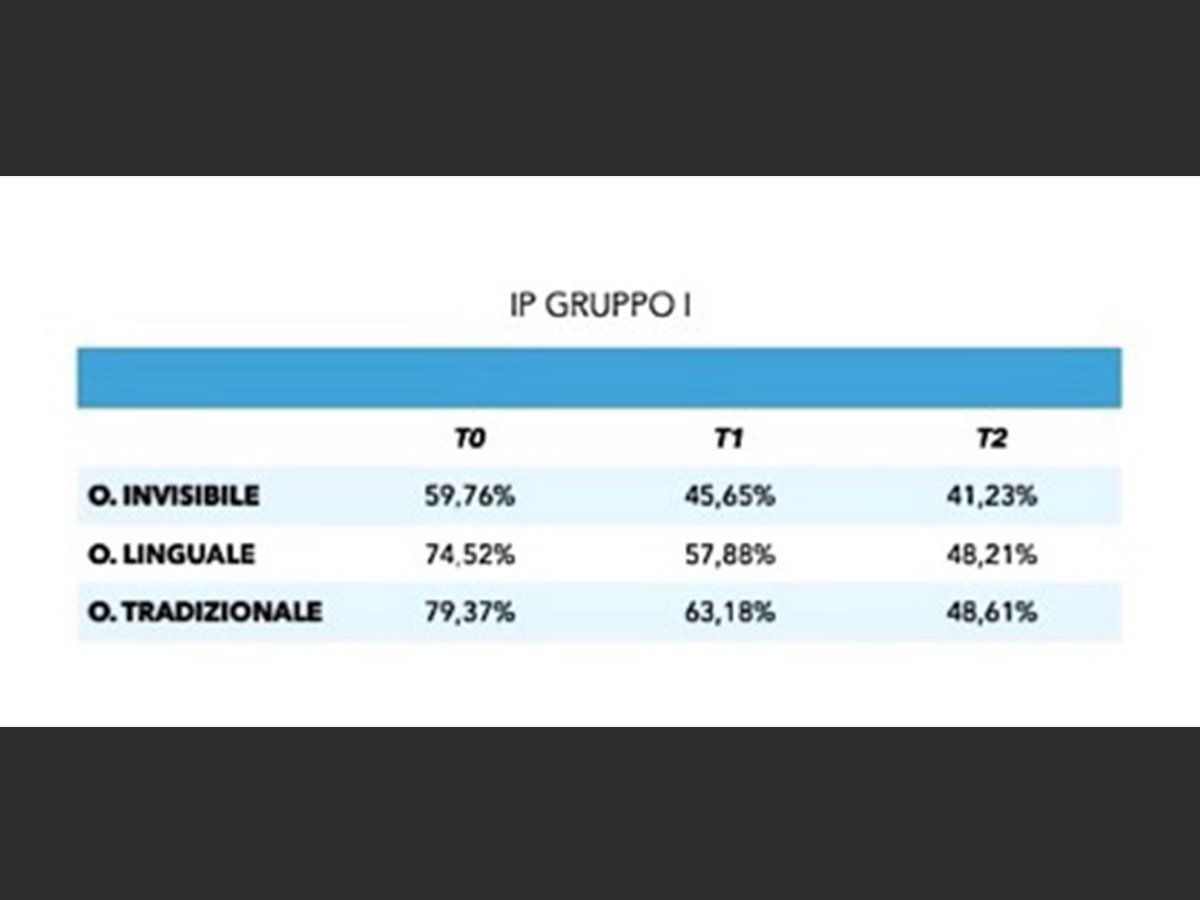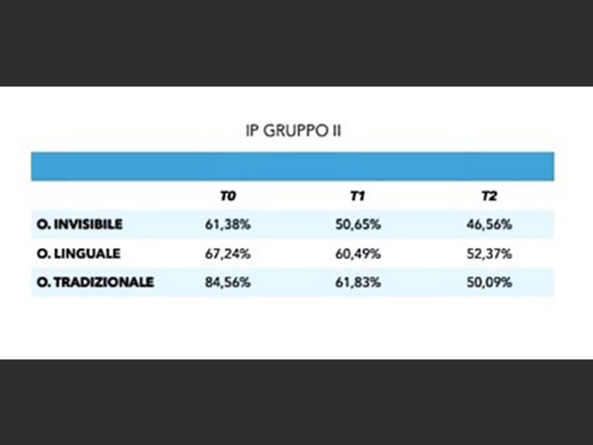 Per quanto concerne l’ortodonzia linguale, il gruppo I ha evidenziato un miglioramento di IP dal 74,52% al 48,21%, il gruppo II dal 67,24% al 52,37%. Non si è verificata una variazione statisticamente significativa con test t student, diverso invece il risultato ottenuto con analisi della varianza che ha dato significatività statistica. IP nei casi di ortodonzia tradizionale non ha dato significatività statistica per entrambi i test statistici utilizzati, nonostante un miglioramento medio da 79,37% a 48,61% nel gruppo I e da 84,56% a 50,09% nel gruppo II (Tabb. 1, 2).