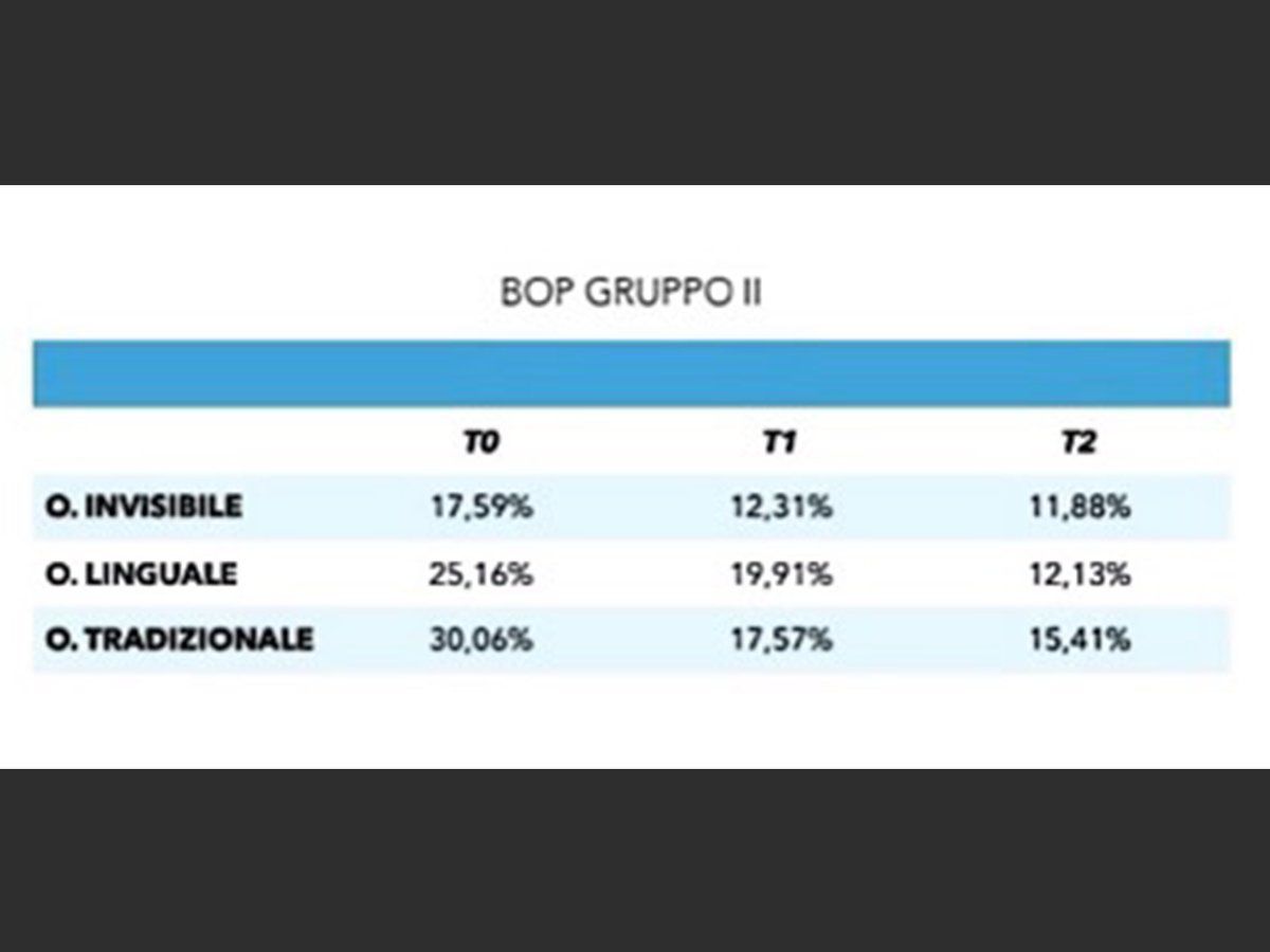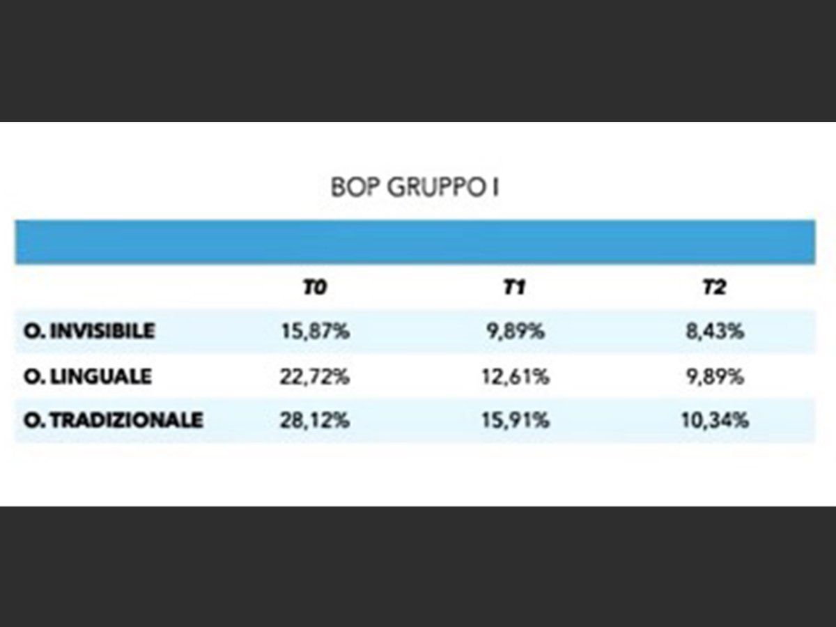 Tab. 3 - Valori delle medie dei risultati inerenti a BOP nel Gruppo I, per tutte le tipologie di ortodonzia.