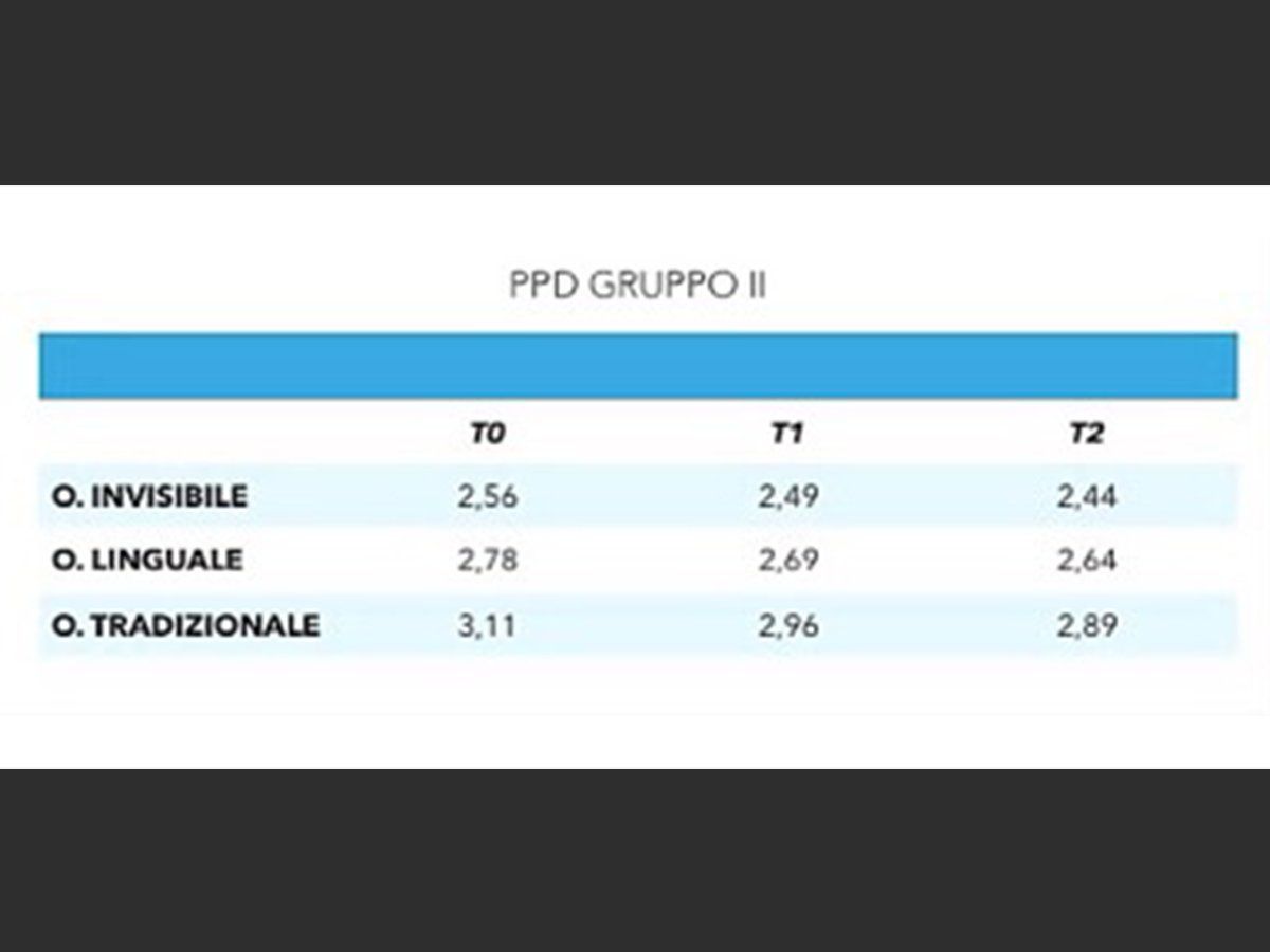 Tab. 6 - Valori delle medie dei risultati inerenti a PPD nel Gruppo II, per tutte le tipologie di ortodonzia.