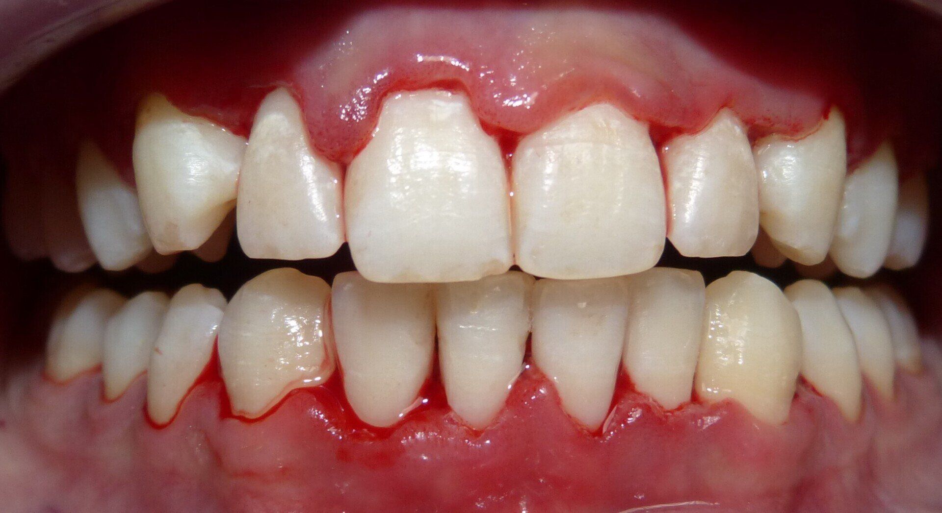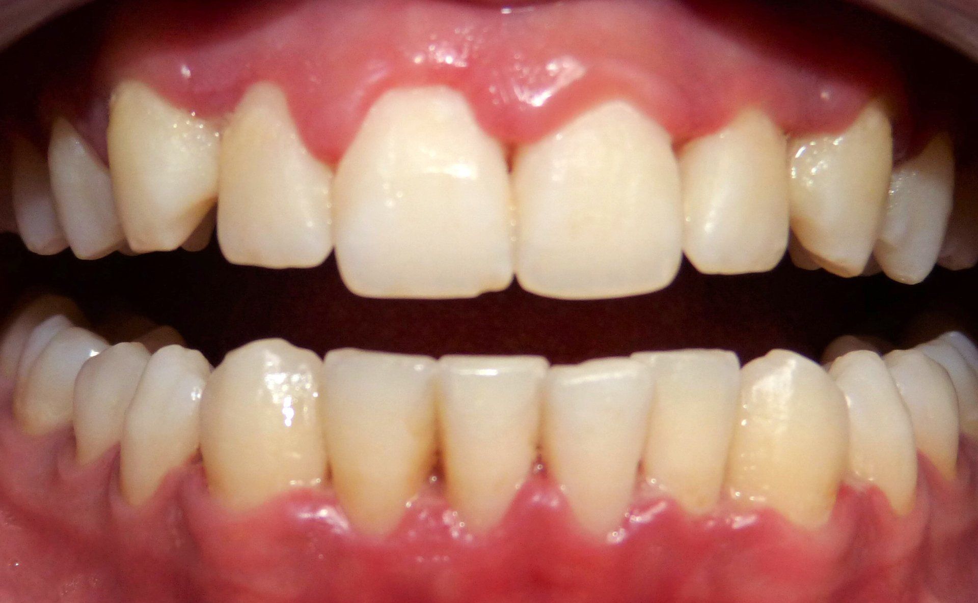 I: Paziente maschio con anamnesi negativa, fumatore. Lamenta un forte fastidio a livello gengivale, riferisce sanguinamento durante lo spazzolamento e talvolta al mattino di trovare sangue sul guanciale. All’esame obiettivo si vedono mucose molto infiammate ed indebolite, papille decapitate, cospicua placca batterica diffusa, tartaro e solo alcune spicole sottogengiva. Patina a livello del dorso linguale.