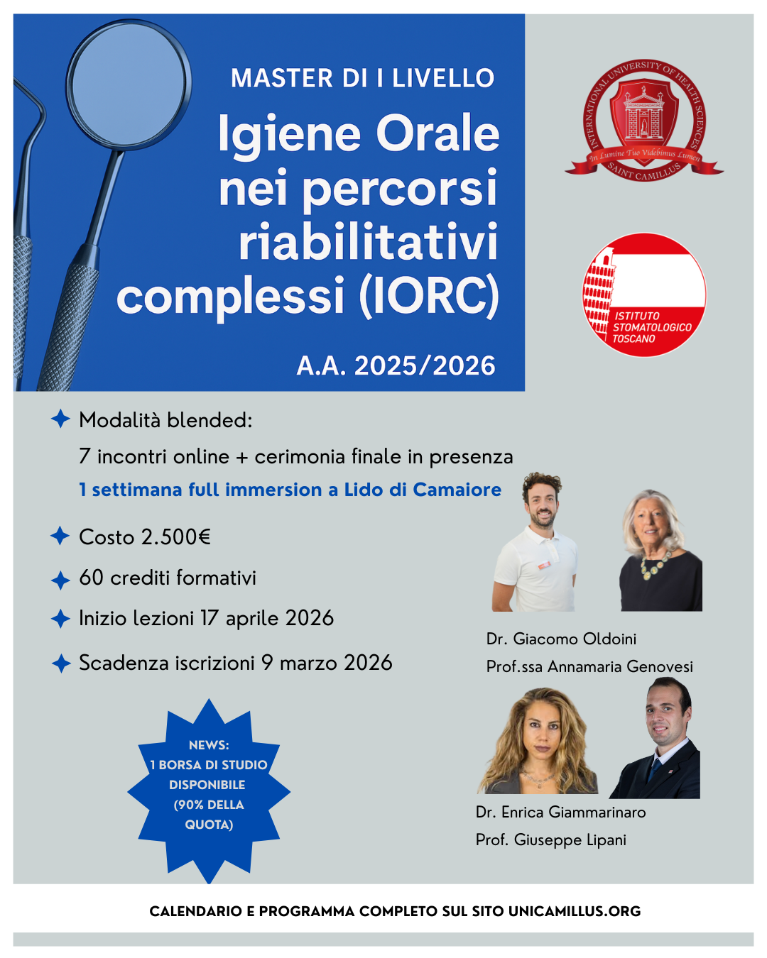Il Master di I livello “Igiene Orale nei Percorsi Riabilitativi Complessi” si pone come obiettivo il perfezionamento del ruolo dell’igienista dentale nell’ambito dei piani riabilitativi complessi, fornendo le adeguate conoscenze per la proattiva interazione con il team in tutte le possibili fasi del percorso terapeutico. Si affronteranno temi circa la profilazione di rischio del paziente in un primo momento di inquadramento, a mezzo dei corretti esami diagnostici e le più recenti tecnologie per la raccolta dati.